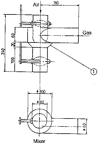 The gas is mixed with the intake air tangentially. This makes mixing very efficient. The gas content is controlled with a flap mounted in the air pipe before the mixing unit. This flap need not to be completely air tight. The power of the ICE is controlled with a flap mounted in the intake pipe after the mixing unit. This flap must be exactly correctly shaped, otherwise the idling speed can not be adjusted. The later flap is equipped with a screw for idling speed adjustment. The flaps must be supported gas tight. Suitable material for the bearing bushes is for example nylon which produces a maintenance-free construction. The flaps are controlled with levers mounted on a suitable location.