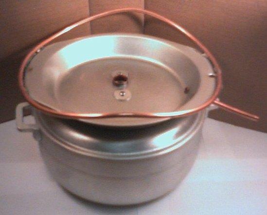 In one rendition the lips around the edges were bent up to hold the top pot into the same position each time it was set on it. Another way was to solder a .25 copper tubing, making a circle, to the pie pan. This keeps the top pot from sliding off. See photo at top.