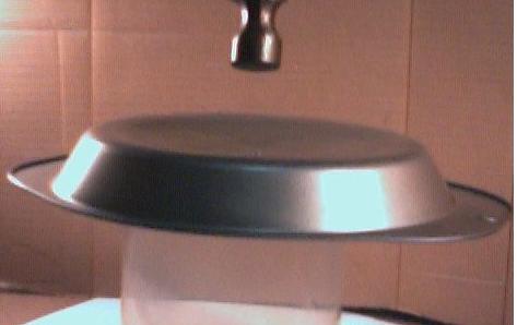 Turn this pan upside down and take a hammer and gently pound the bottom into a dome to match the curvature of the lid on the bottom pot. I used an old lid from a CD-ROM 100 dispenser to support it while gently pounding on the pie pan with a hammer. See photo below. Move the CD dispenser or large pipe support around to near the side as you work your way around from center to edge, then from center to edge. Small dents from each hammer stroke gradually make a budge that will eventually fit the curvature of the lid for the bottom pot.