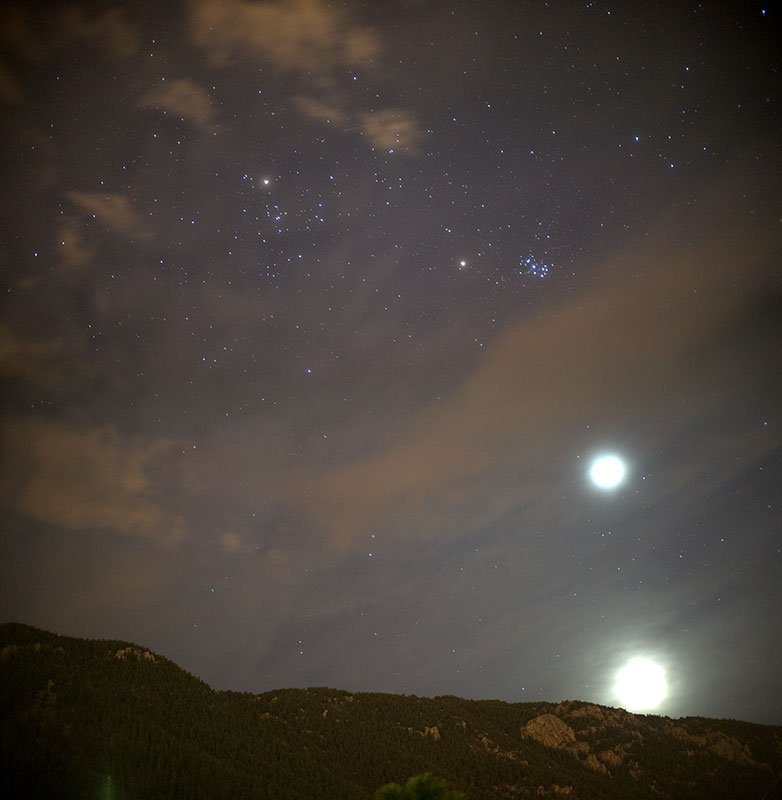 From Cascade, CO, the Original from the web site available for download also. The blowups below were done by Nancy, example of pasted large stars over air brushed cloud cover, and pixel differences at the Mars location. The pixels in Mars are much smaller than in the Pleiades.