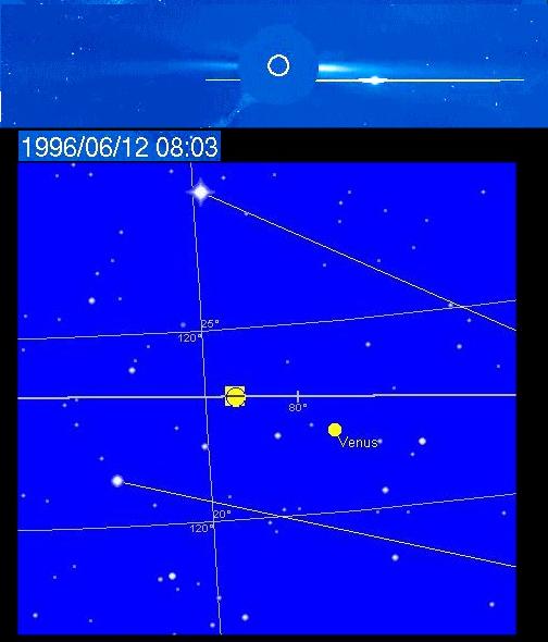 I found the pictures of some transits of Venus. Nobody has noticed the past transit of 1996 that was almost against the Sun. SOHO is not aligned to the perpendicular of the ecliptic. When the planet is in front of the Sun, the error of alignment between SOHO, the planet and the Sun is bigger (due to the complex orbit of soho).