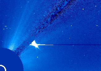 What's that at 1:00 close to center! target="_top"> 20030811_1518_c3.gif Looks like a tube with flames coming out of one end! [and from another email] LASCO C3, please view. A cloud around the sun and another comet? I missed checking this web-site last night, but the night before, the star or bright comet (at one-o'clock), was note there. Is this significant? [and from another email] I have followed Lasco images for some time and here is a weird anomaly. SOHO has been down since Aug 11. Check this out the last target="_top">LASCO C2 image http://sohowww.nascom.gov/data/realtime/javagif/gifs_small/20030811_1506_c2.gif [and from another email] Look/see the LASCO C3 latest [Aug 14] pix, and see the 'extra' star that's coming into the field of view. Venus is there also, hiding behind the 'arm' that holds the blocking disc for the sun. According to the 'Sky & Telescope' interactive sky-viewer, the only star next to the Sun is Venus. What is this other star. The SOHO web site showing LASCO C3 hasn't been updated for 3 days now, ever since this 'other' star showed up on-screen. [Note: Planet X is presumably behind the arm, and Venus misplaced. Earth’s rotation and orbit affected by Planet X.]