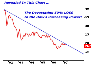 It appears that the efforts by the Powers that Be to keep the gold price from rising (dollar's market value from falling against gold) are becoming quite frantic. Many suspect that they are running out of both physical gold and the ability to manipulate the "paper gold" markets. Are they about to crack? [and from another] How the Dow Jones is getting killed - Due to loss of purchasing power / Stock-Markets / Analysis & Strategy [Feb 16] http://www.marketoracle.co.uk/ On January 3, 2000 the Dow was trading at 11,357. Put another way, if you bought every stock in the Dow back then, you'd have invested $11,357. That same $11,357 on January 3, 2000 would have also bought you 39.3 ounces of gold. Now, fast forward to late last week, when I performed this study. On February 6, 2007 the Dow was trading at 12,666. In pure nominal terms, the Dow has gained 1,309 points since January 2000, or 11.5%. We'll ignore the fact that that's a lousy return over seven years. At least the Dow was up, right? Hardly! In terms of the Dow's purchasing power, the Dow of February 6 only buys 19.39 ounces of gold. In other words, it's lost 50% of its purchasing power when measured in real money!