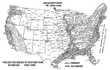 Why do so many future maps show the western portion of the United States submerged or assaulted by water? The Zetas have this in a state of mountain building, albeit with high tides during the hour of the shift, but not with Arizona, Nevada, Colorado, etc submerged. This flooding of the west coast appears in Lori Toye's 1983 channeled map, the first to be widely published. Then in Scallion's map representing his vision, Chet Snow's map representing the hypnosis of hundreds, and the Dolores Cannon map also representing hypnosis of many. They have the west coast going down, apparently, the reverse of what the Zetas tell us will happen other than that the inland valley's of California will be flooded for weeks due to water being trapped by the sloshing over the coastal mountains. Only the 1950 map by Pitre show the mountain regions above water, in concurrence with the Zeta message.