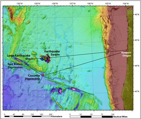 This weekend scientists will take to the water to try to puzzle out the cause of a "swarm" of mysterious earthquakes that has shaken the seafloor near Oregon in recent weeks. About 600 earthquakes have been recorded in a small region about 190 nautical miles (350 kilometers) offshore from Yachats. Most of the temblors were small, about magnitude 2 or 3, although a few were magnitude 4 or 5.