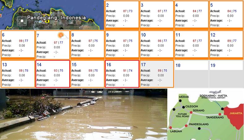 Sinking on the plate tongue holding Indonesia primarily occurred on the island of Java during the past two weeks, as these news articles up to March 17, 2011 show. Strikingly evident is the subsidence and flooding despite rain. Near Jakarta, districts in Pandeglang report flooding that does not subside - "The flood has not subsided". Note the utter lack of rain during this time, not even an inch. The river overflows, but this is not from rain but a failure to drain at all into the sea. The land is sinking!