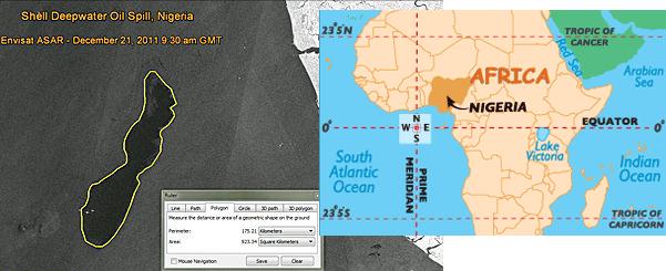 African stretch zones also tell this tale. Recently a building in Lagos, Nigeria suddenly collapsed, a clear sign of a stretch zone accident as reported in Issue 271 of this newsletter. As Africa rolls, the top and bottom part of the continent are tugged in different directions, pulling the continent apart somewhat at Nigeria. Hold the top part of Africa firmly in your left hand, and grasp and pull the bottom part toward the east with your right hand, and you can sense what is happening there, at Nigeria. Now an oil spill has resulted, on December 21, 2011 from this same stretch.