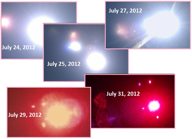 Note the correlation in photos from Brazil on July 27, 2012 and California on July 30, 2012 and another from someplace in the USA on August 2, 2012. The placement of the brilliant and huge Moon Swirl to the left/top of the Sun appears in all. The California photographer moves his cam around so the lens flares can be easily distinguished. The Moon Swirl remains firmly in place at the 11 o’clock position. Moon Swirl orbs cast their brilliant light, like the light that comes out the end of a flashlight, when the long tube of the swirl is pointed toward Earth. Sunlight bounces down the walls of the tube and is focused out the end.