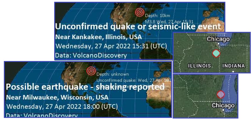 And back in the Good Old USA the Mainland Portion is ready to rip and getting charged up. On that same April 27 the USA had a new symptom in the Mainland Portion – shaking. Rather than the hum, which is indicative of vibration due to tugging tension, and rather than a quake, which is indicative of rock pulling apart or colliding, Volcano Discover reported shaking in Murphy’s Settlement across from St. Louis, in Kankakee above the Wabash Seismic Zone, and in Milwaukee. The Zetas explain.