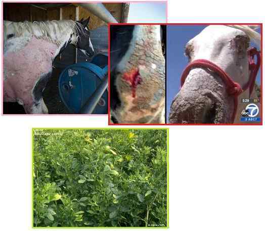 I came across this article. I have had horses all my life have never seen anything like this. Could the Zeta's tell us something concerning this illness? [and from another] http://www.hesperiastar.com/article/20140805/News/140809900 Equine owners in Phelan are still dealing with sick animals and remain unsure of what caught many horses to manifest swollen eyes and lips as well as blisters on their muzzles. [and from another] http://losangeles.cbslocal.com/2014/08/06/dozens-of-socal-horses-mysteriously-sick-cause-of-condition-undetermined/ Dozens Of Horses Mysteriously Sick With Undetermined Condition. It’s devastating… I’ve got my national champion, who her entire body, her entire first layer of skin is going to fall off.” [and from another] http://enenews.com/tv-heartbreaking-mystery-illness-hits-california-horses-will-skin-falling-bodies-covered-lesions-eyes-swollen-shut-liver-damage-fainting-expert-never-anything-like-40-year-career-video Devastating mystery illness hits California horses — “Nobody will even tell us what it is” — Skin falling off, covered in painful lesions, eyes swollen shut, liver damage, fainting — Expert: Never seen anything like it in 40 year career. [and from another] https://www.morningagclips.com/hay-tested-after-calif-horses-become-ill/ Hay fed to some California horses was not tainted, according to a University of California, Davis (UC Davis), professor, but instead contained a naturally occurring, yet-to-be-identified chemical that made those animals photosensitive. Photosensitivity is a condition that causes horses to be particularly sensitive to light. Affected horses can develop a sunburn-like skin condition, skin cracking, blistering, or peeling. Some highly sensitive horses can also experience liver damage if they ingest highly photosensitive plants. [and from another] http://www.library.illinois.edu/vex/toxic/alfalfa/alfalfa.htm Alfalfa is an excellent forage crop when harvested and stored properly. However, the plant can cause "hepatogenous photosensitivity syndrome" if water-damaged. [and from another] http://www.nlm.nih.gov/medlineplus/druginfo/natural/19.html Alfalfa might also cause some people's skin to become extra sensitive to the sun. Wear sunblock outside, especially if you are light-skinned. [and from another] http://vet.sagepub.com/content/1/6/469.full.pdf In all known occurrences, the disease was associated with the feeding of first-cutting alfalfa hay grown on lowlands along streams. The alfalfa had been subjected to damage by heavy rains and flooding prior to harvest during the unusually wet spring