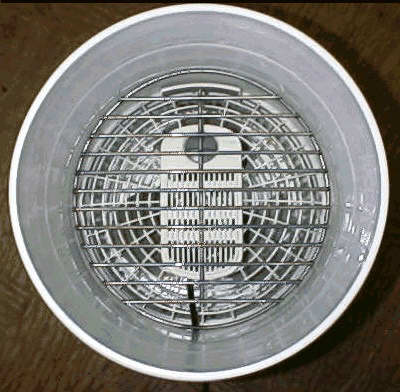 The filter material is cut about .5" bigger in diameter than the bucket at the level it will be pushed down to. This makes it about 11" in diameter. The more flexible the filter material the less critical the size it can be made bigger and will still stay flat once put in. Start with a stiff "universal washable filter" or optionally the barbecue replacement Grill this holds the filters flat and a bit away from the fan.
