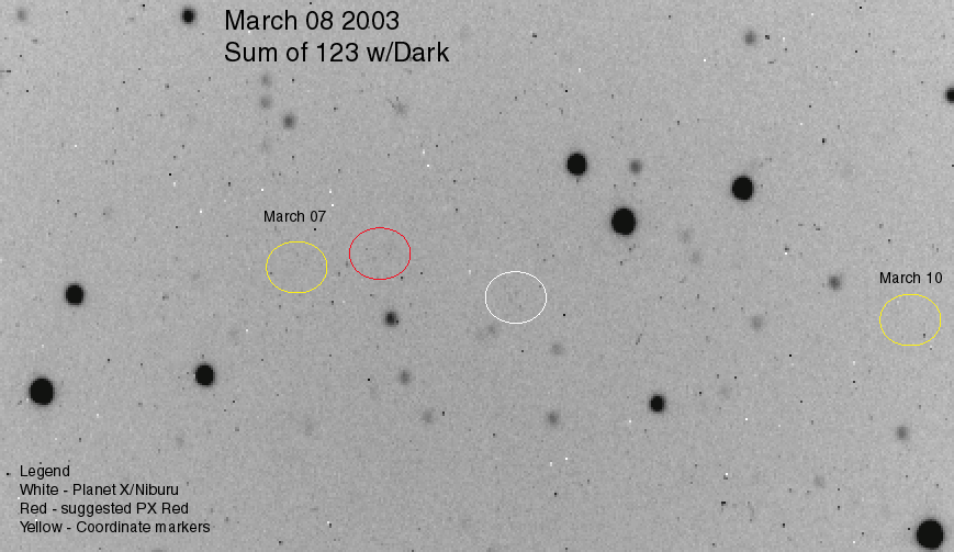 This is a Sum or Frames 1, 2, and 3 Sum (1 hour) with the Dark. I find Planet X/Niburu standing out well on these three individual frames and in combination. Right on path between March 07 and March 10 coordinates. Slight movement between frames. (Scintillation or travel?) This probable Planet X Red object shows on Frame 1 and 2 at this location (slight left of faint star) and has moved over the images. I don't find Planet X Red at what would be the usual position relative to Planet X/Niburu White. Have not had time to look at all the other debris and moons, will pursue that later.