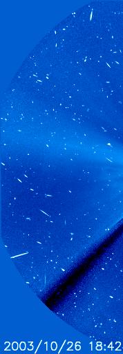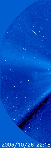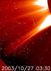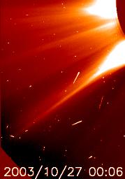 Has anyone noticed the sandblasting of the SOHO photos from today, Oct 27. I have been watching the site on a daily basis for over two years and have never seen any pictures with so much debris (stuff, clutter, objects). If the SOHO camera can pick up those objects how long before the debris field will reach our atmosphere? Should we be expecting a huge meteor shower in the next couple days?