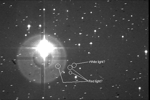 - I guess the two closest red light candidates to what we would expect are the ones on frames 5 and 9. They are in the same RA position with the one on frame 9 being higher, about half-way closer to the white light position. I have the one from frame 9 as being considerably brighter, registering a total intensity for the 4 pixels of 4227 on MaxIm DL as compared to 1487 for the one on frame 5 with the average background pixel around 150-200.